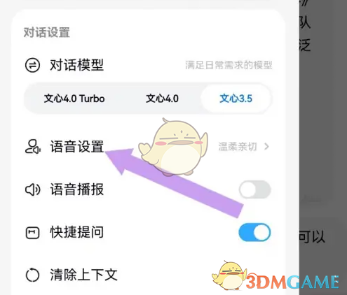 2、接着在打开的侧边栏中,找到“语音设置”并点击,进入设置页面,如下图所示: